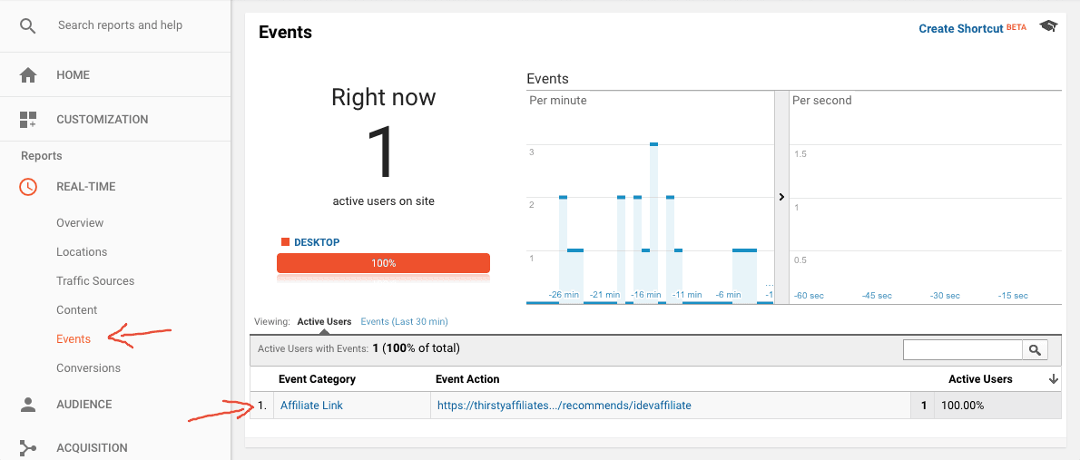 Cliquez sur Evénements sur vos liens d'affiliation pour accéder à votre profil Google Analytics en temps réel :